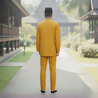 TELUK BELANG Malasia SIPO Collar de mandarín amarillo mostaza tradicional Baju Melayu con Songkok, camino gris y edificios de madera